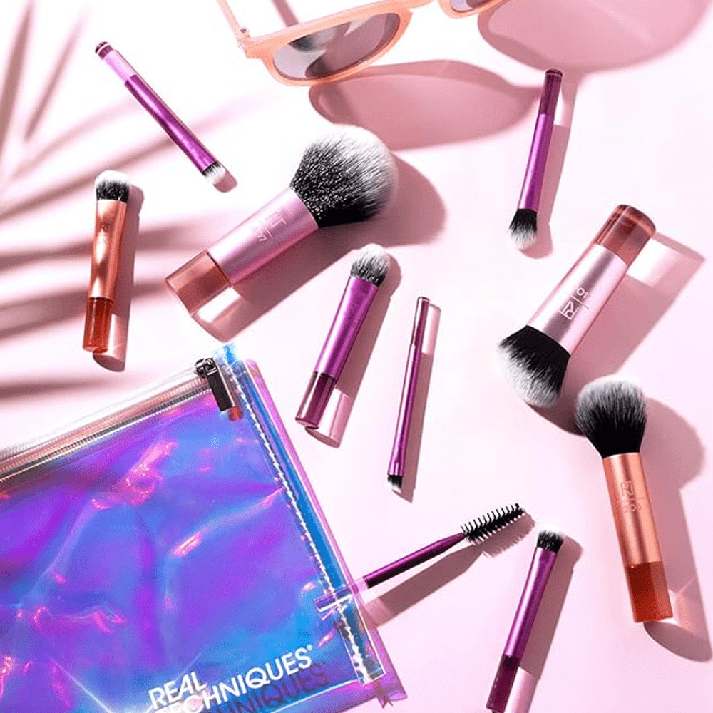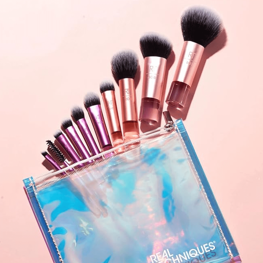مجموعة فرش مكياج صغيرة من ريل تكنيك تحتوي على 10 قطع متنوعة من فرش الوجه.