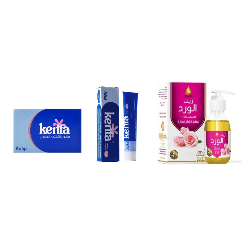 •تجمع بين فوائد زيت الورد المغذي، وكريم كينتا المعروف بتأثيره على تفتيح البشرة، وصابونة كينتا للتنظيف العميق والتفتيح.
