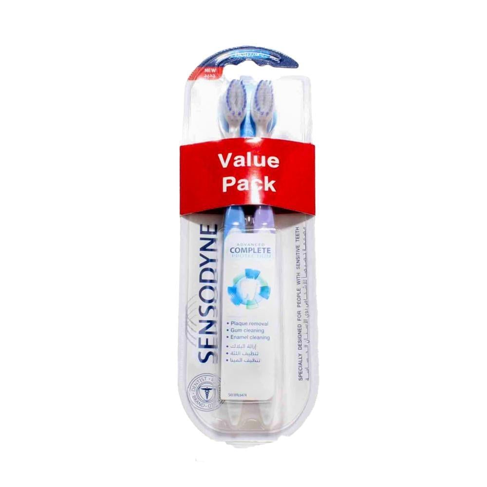 سنسوداين فرشاة الأسنان ناعمة تأتي في عبوة تحتوي على قطعتين باللونين الأزرق والبنفسجي.