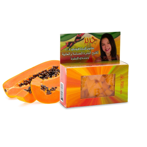 صابون البابايا فروتي 4×1 الفلبيني للتبيض 135 غرام : صابون البابايا بالفواكه هو صابون عشبي فريد وممتاز لتفتيح البشرة مع خصائص ترطيب. إن إنزيم البابين هو المكون الرئيسي لهذا الصابون ويعزز التجدد السريع لخلايا الجلد وتحويل الخلايا. كما أنه فعال للغاية في تقشير خلايا الجلد الميتة وله خصائص ترميمية على الجلد. يعمل الصابون على ترطيب البشرة بشكل فعال ويمنحها النعومة والسلاسة. يحتوي هذا الصابون ذو الأساس العضوي على رائحة فاكهية لطيفة. مميزات ومواصفات صابـون البابايا فروتي 4×1 الفلبيني للتبيض صابون البابايا بالفاكهة هو صابون لتنظيف البشرة وتفتيحها يعزز التجديد السريع لخلايا الجلد يقشر الجلد الميت ويعيد صحة الجلد يرطب البشرة ويمنحها الترطيب الفوري وينعم البشرة الجافة يمنح البشرة نعومة وراحة تخلص البشرة من آثار حروق الشمس وحب الشباب. تساعد في التخفيف من علامات الشيخوخة والتجاعيد. كيفية استخدام صابون البابايا فروتي 4×1 الفلبيني للتبيض اشطف وجهك و/ أو جسمك بالماء جيداً قبل غسله بقطعة صابون ضعي الصابون على شكل رغوة ثم ضعيه على وجهك باستخدام يديك أو ليفة دلكيه بلطف على بشرتك بحركة دائرية اشطف الصابون بالماء بعد ذلك استخدم منشفة أو ليفة لدعك جسمك حيث تمتص الرغوة من الصابون وتحتفظ بها لاستخدام إضافي الاحتياطات: للاستخدام الخارجي فقط. تجنبي ملامسة العينين. يُحفظ بعيدا عن متناول الأطفال. الوزن: 135 غرام